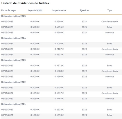 Todos los últimos dividendos crecientes pagados por Inditex | Fuente: Bankinter
