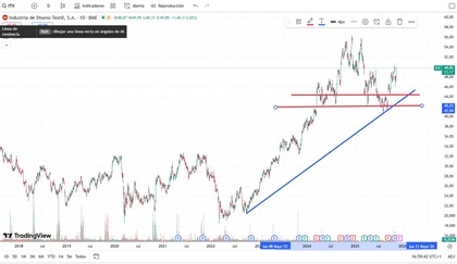 Entrada conservadora (línea roja más baja): Mientras que la entrada más tranquila, estaría en el nivel de los 42€ por acción, justo por debajo de toda la estructura alcista que lleva desde enero de 2024, y que siempre que retrocedió a dicho nivel (desde entonces) rebotó con fuerza.