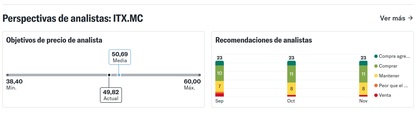 ¿Cuáles son las opiniones de los expertos respecto a las acciones de Inditex | Fuente: Yahoo Finance