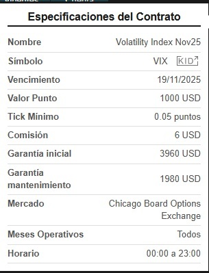 Cada tick equivale a 50 dólares (ya que el contrato se calcula como índice x 1.000 USD). Por tanto, un movimiento completo de 1 punto en el VIX supone una variación de 1.000 dólares por contrato.