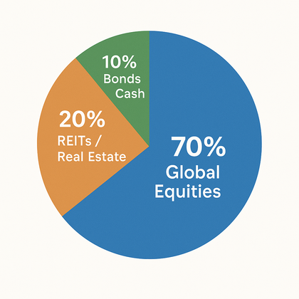 Su cartera era sencilla, diversificada y diseñada para durar décadas. El 70% estaba en fondos indexados globales —incluidos EE. UU. e internacionales— y un REIT de bienes raíces. Nada de apuestas ni búsquedas de la “próxima gran acción”: solo largo plazo, bajo coste y amplia diversificación.