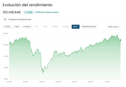 👉 Por aquí te dejo un ejemplo simulado en tiempo real de la cartera Ideal Index Portfolio en nuestra plataforma MyPortfolio, para que veas qué rendimiento ha tenido en los últimos meses (también puedes crear la tuya propia si lo deseas): Cartera Ideal Index Portfolio en MyPortfolio Evolución de la cartera Ideal Index Portfolio en MyPortfolio