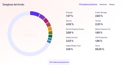Con todo, agrupa unas 330 posiciones relacionadas con el sector inmobiliario cotizado, principalmente de EEUU (62%) y Japón (8%), en el que las 10 mayores posiciones tienen un peso de alrededor del 33 %, donde destacan nombres como Prologis (7,1 %), Equinix (5,0 %), Digital Realty Trust (3,5%) o VICI Properties (1,5%).