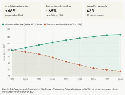 Según datos de TeleGeography e Infra-Analytics, para 2040 casi la mitad de esos barcos habrá llegado al final de su vida útil. Justo cuando el volumen de cables desplegados haya crecido un 48%. Más cables que nunca, y menos barcos para repararlos.
