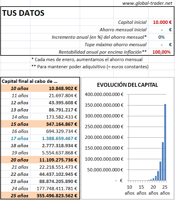 Con tan sólo 10.000€ de capital inicial invertido, tendría 10 millones al cabo de 10 años, y atentos al dato: ¡¡¡ más de 350.000 millones de euros al cabo de 25 años !!! ¿Se dan cuenta de la barbaridad absoluta que estamos planteando?