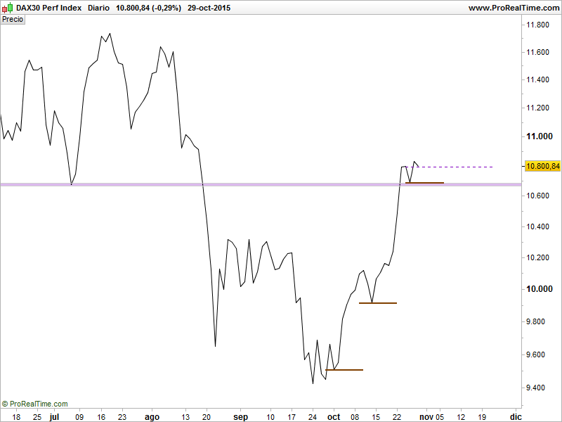 Si especulamos o invertimos por Análisis Técnico en diario, este gráfico no deja lugar a dudas, mínimos-máximos ascendentes, sin más. Todavía no entiendo como en algunos medios de comunicación desde hace una semana, aparecen analistas técnicos opinando que esto se viene abajo. Estoy seguro de que el momento llegará, pero antes de la opinión, viene la observación y ahora mismo el precio dictamina que por encima de 10.670 enteros a cierres diarios es alcista, estaremos o no en proceso impulsivo o de rebote, esta por ver. Invitar a la prudencia por estos niveles me parece acertado y correcto, pero de ahí a ... " esto se viene abajo " con una semana de antelación, me parece excesivo. Cuando quiebre el primer mínimo, entonces.