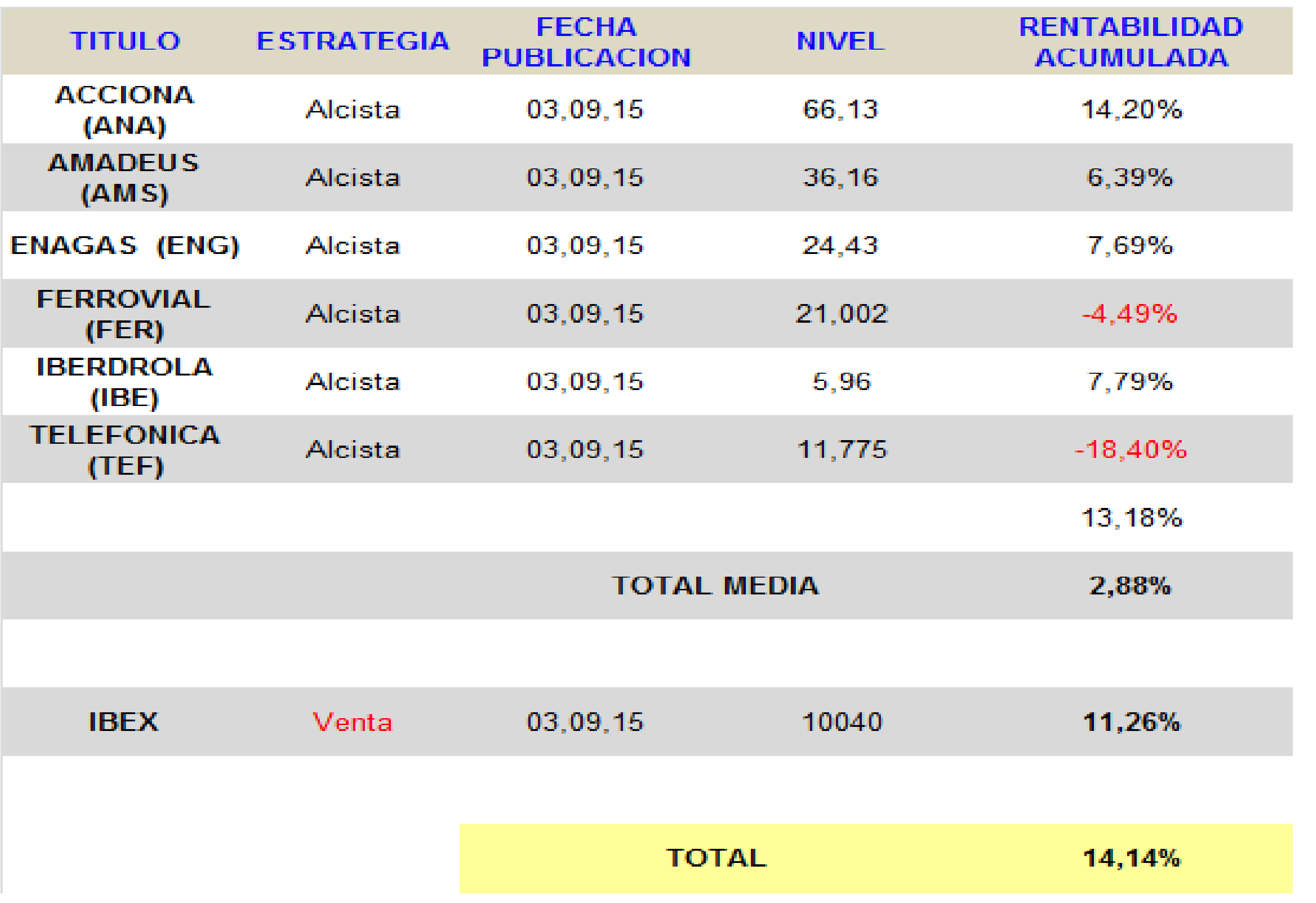 Todas las posiciones son las mismas de " Origen ", las características principales de la cartera están debidamente detalladas en mi blog, de las cuales ya he comentado un extracto del mismo. No sólo estaba preparada para un mercado lateral-bajista, también para uno alcista, de ahí la exposición en TEF, su papel principal, cuando el mercado rebotaba ajustaba Beta con el índice y el rendimiento se mantenía e incluso en algunas ocasiones subía, si bien es verdad que la mayor rentabilidad viene proporcionada por una debilidad del índice frente a la fuerza relativa de los valores que la componen. El resto es historia, en tres meses un 14,14 % de rentabilidad. Recuerden siempre el pie de mis comentarios.