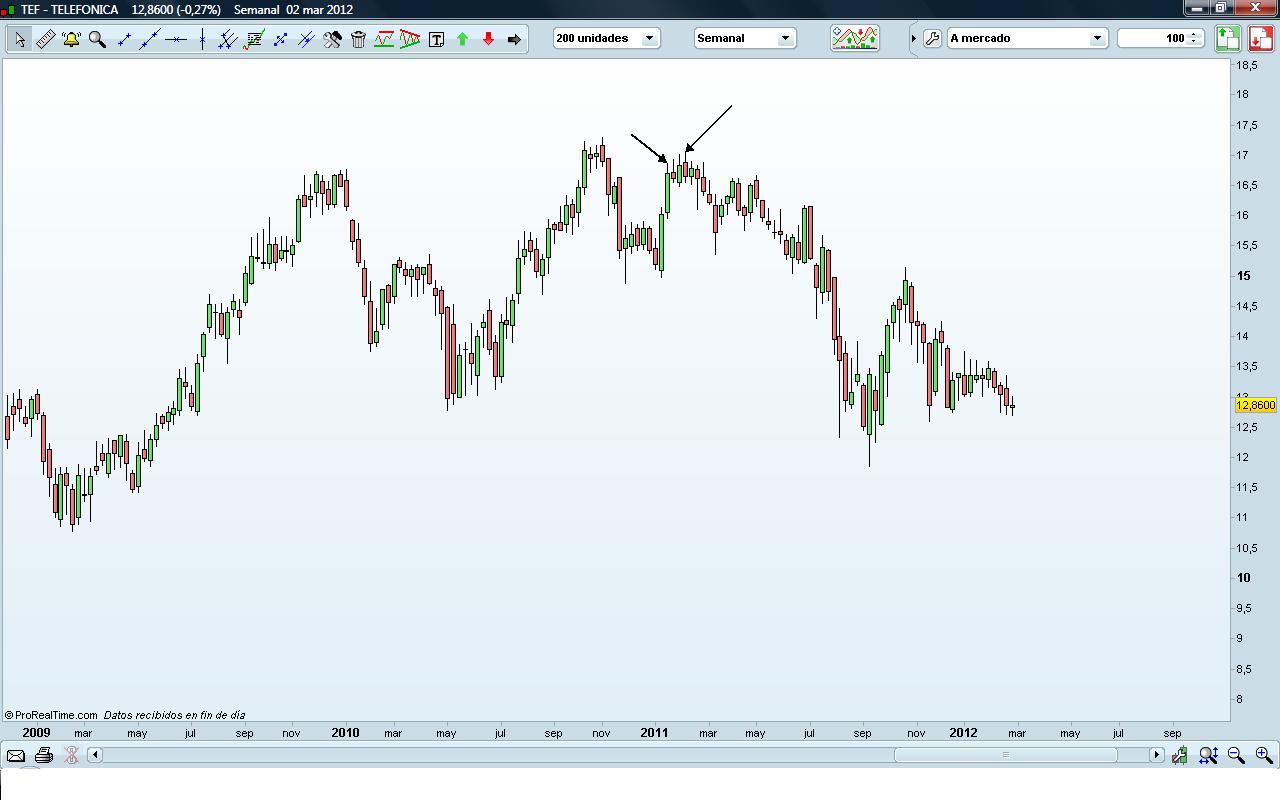 Este es el gráfico semanal de Telefónica (cada barra representa una semana), desde mediados de 2008 hasta la fecha actual, más o menos mi amigo compraría entorno a los 16,5 euros, en Enero de 2011, señaladas con las flechitas, Telefónica cerró ayer a 12,86, vamos a hacer unos cálculos rápidos. En este año que ha mantenido las acciones vamos a suponer una ganancia media en dividendos de un 10%, pero las compró a 16,5 y ahora está a 12,88, lo cual supone una pérdida en la acción de un 22%, por un lado le han dado un 10%, y por otro le han quitado un 22%, está perdiendo entorno a un 12% de su dinero. Y lo que yo creo, y no soy el único que piensa así, es que lo peor aún no ha pasado.