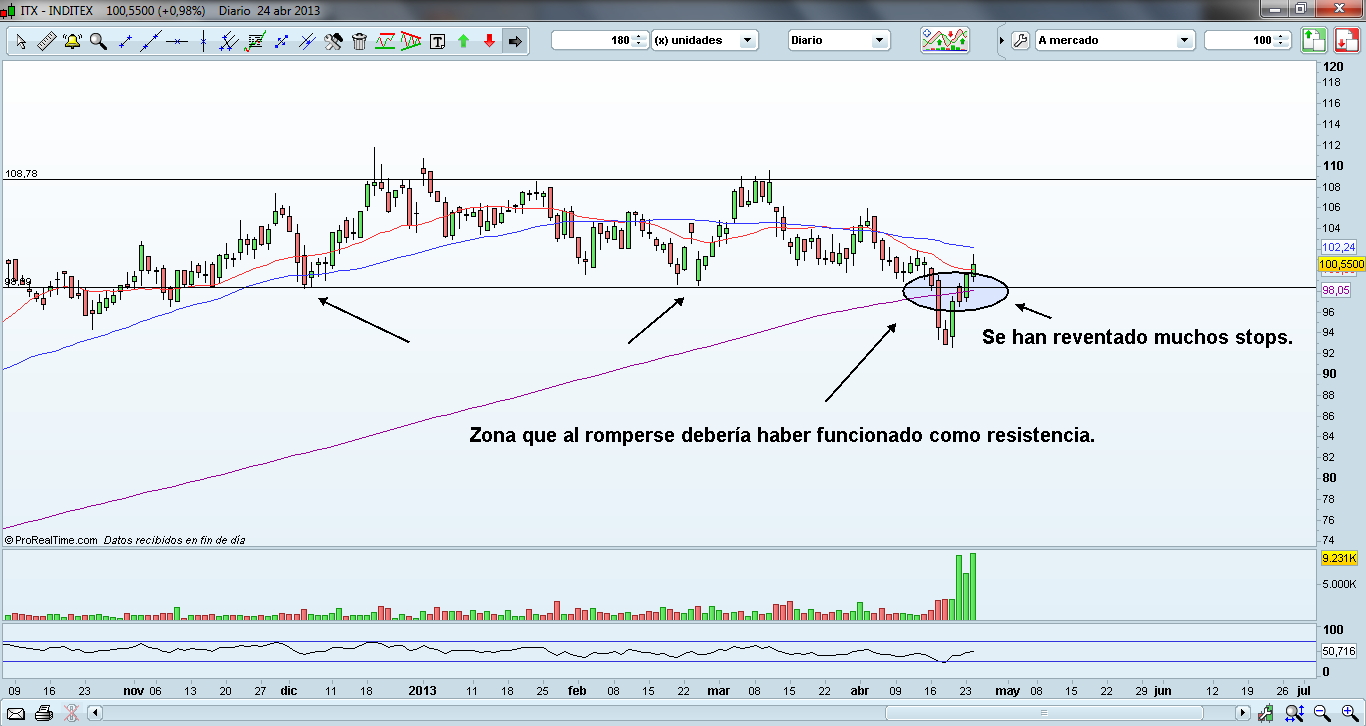 Pero es que tras cerrar el largo decidí abrir al día siguiente un corto en los 97,45€ (que publiqué en facebook y twitter), cosa que como comenté no me gusta hacer, no me gusta salir de una posición larga y abrir acto seguido y el mismo día un corto con el mismo valor para evitar precisamente lo que me ocurrió, y es que tras abrir el corto (lo abrí al día siguiente) he tenido que cerrarlo en 101€ asumiendo de nuevo la pérdida ¡y metiéndose de nuevo en el canal!. Lo que molesta de esta operación es que se te queda una cara de tonto bestial. Sientes cómo has sido manipulado, pisoteado, borrado, BARRIDO!!. No es por la pérdida de dinero en sí, ¡es orgullo lo que está en juego! Y es que en la zona que marco con un circulito han hecho un auténtico destrozo de stops, han limpiado a todas las posiciones largas, incluso hoy a muchas cortas, aunque está claro que habrá gente haya salido beneficiado, pero el barrido ha sido espectacular. Ojo, que el análisis técnico no es infalible, que ya sabemos que las resistencias están para ser superadas y los soportes para ser rotos.