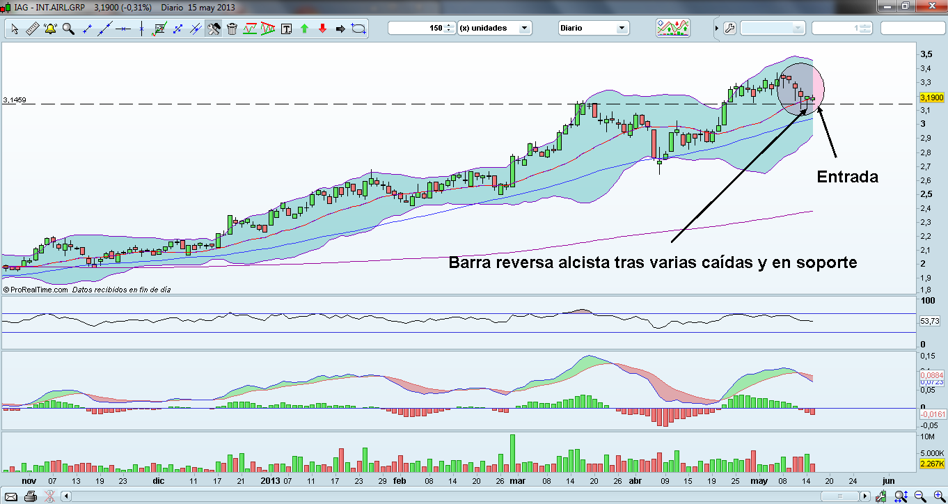 Tras hacer algunas operaciones intradía con el EUR/USD y una operación con ANA (amore mio, que no, que no es nombre de mujer joe, que es Acciona), publicadas algunas en Facebook y Twitter vi anoche una gráfica de las que me gustan, los que siguen el blog sabrán que es de mis entradas favoritas, no es tan clara como la situación que se produjo con Apple meses atrás y que analicé en este artículo, pero me pareció una interesante oportunidad para intentar una entrada. La empresa es IAG.