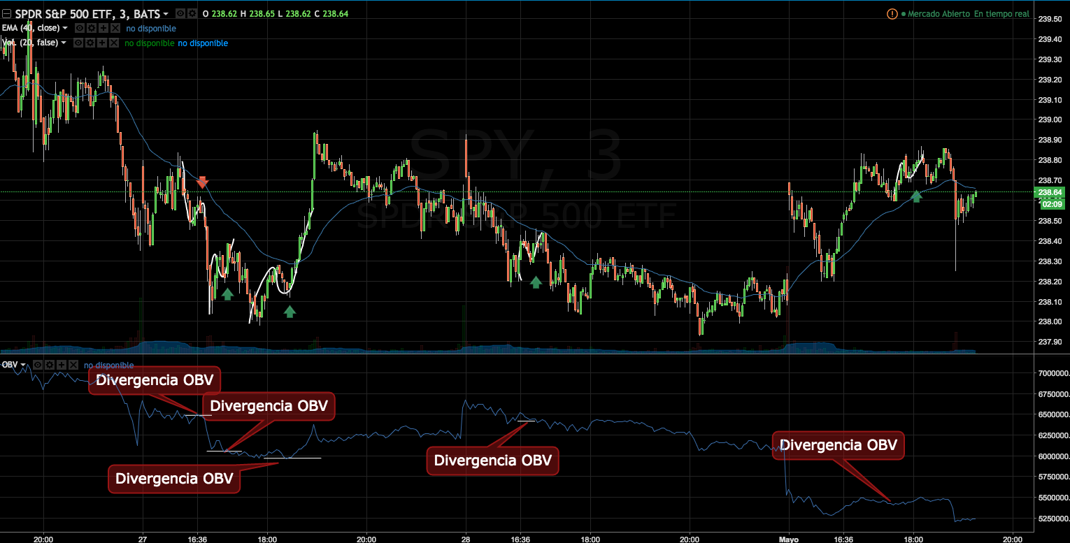 Una muestra para que veas de lo que te hablo. Como puedes ver en los gráficos que te subo, el precio muchas veces inicia un movimiento alcista, con los movimientos bajistas es lo mismo pero al reves, y el OBV acompaña al mismo, pero ¿qué pasa al retroceder después? Que mientras que el precio del activo se queda en un retroceso que no pasa del 50% el indicador OBV retrocede prácticamente hasta el mismo nivel desde donde inició la subida. ¿Qué indica esto? Pues que el volumen en el movimiento bajista ha sido fuerte, síntoma de que si el precio sube de nuevo es probable que veamos un movimiento alcista fuerte a corto plazo, entre otras cosas por el cierre de posiciones bajistas. Ese es el tipo de movimiento que queremos ver en el OBV, el precio marcar, en el caso de un movimiento alcista, mínimos más altos mientras que el OBV muestra ese tipo de divergencia negativa. Este sería el primer ingrediente.