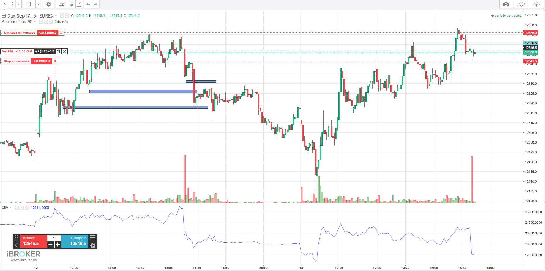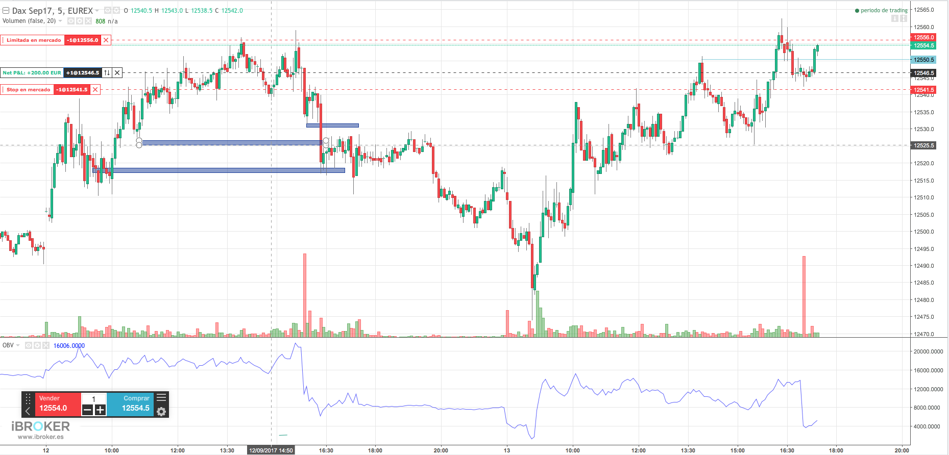Otro ejemplo con el futuro del DAX. Periodo de consolidación, ruptura y retroceso. Divergencia negativa del OBV y ruptura vela anterior, con algún matiz. Stop por debajo mínimo y objetivo antes de que llegue al máximo anterior, pero con una ganancia media mayor a la pérdida media. Otra forma de buscar el retroceso.