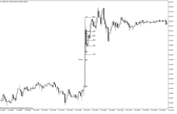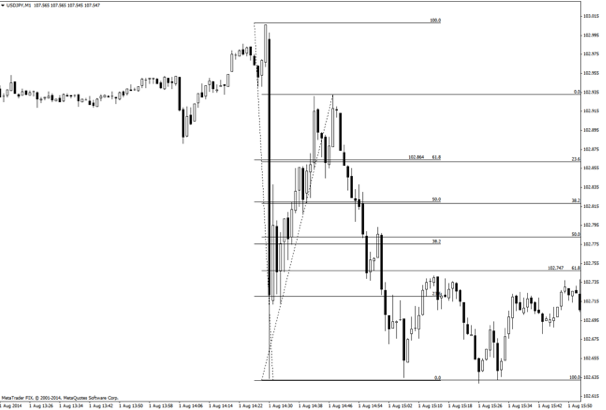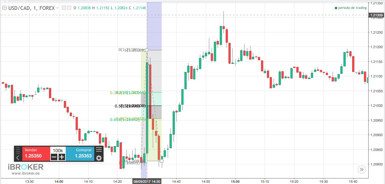 ¿Qué haremos a continuación? Trazamos los niveles de fibo desde el cierre de la vela anterior, de un minuto, a liberarse el dato. A partir de ese momento, y una vez que se han alcanzado los 30 pips, esperamos a que corrija acercándose al nivel del 38%. Una vez que lo haga trazaremos el fibo inverso para colocar la orden de entrada en el 50%, con el primer objetivo en 100% pudiendo ir a por un segundo objetivo en 161%. Por supuesto, tenemos en cuenta la re-entrada en caso de que haga lo que llamo un “a la segunda va la vencida”.
