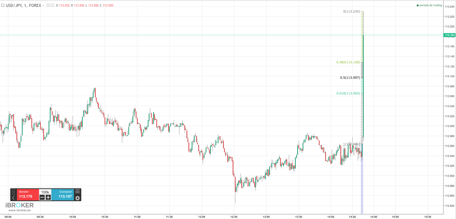 Como estarás leyendo está el personal analizando lo que quiere decir y lo que no los datos que hemos tenido hoy, pero a efectos prácticos tuvimos un movimiento de más de 20 pips, en este caso, casi 30. Muy poco para un dato de este calibre, que normalmente suele estirar el par en el primer minuto más allá de los 50 pips. ¿Qué hacemos cuando veamos un movimiento así en un dato importante? Trazar el nivel del fibo, para esperar que retroceda más del 38% pero menos del 100%. Esto fue lo que pasó.