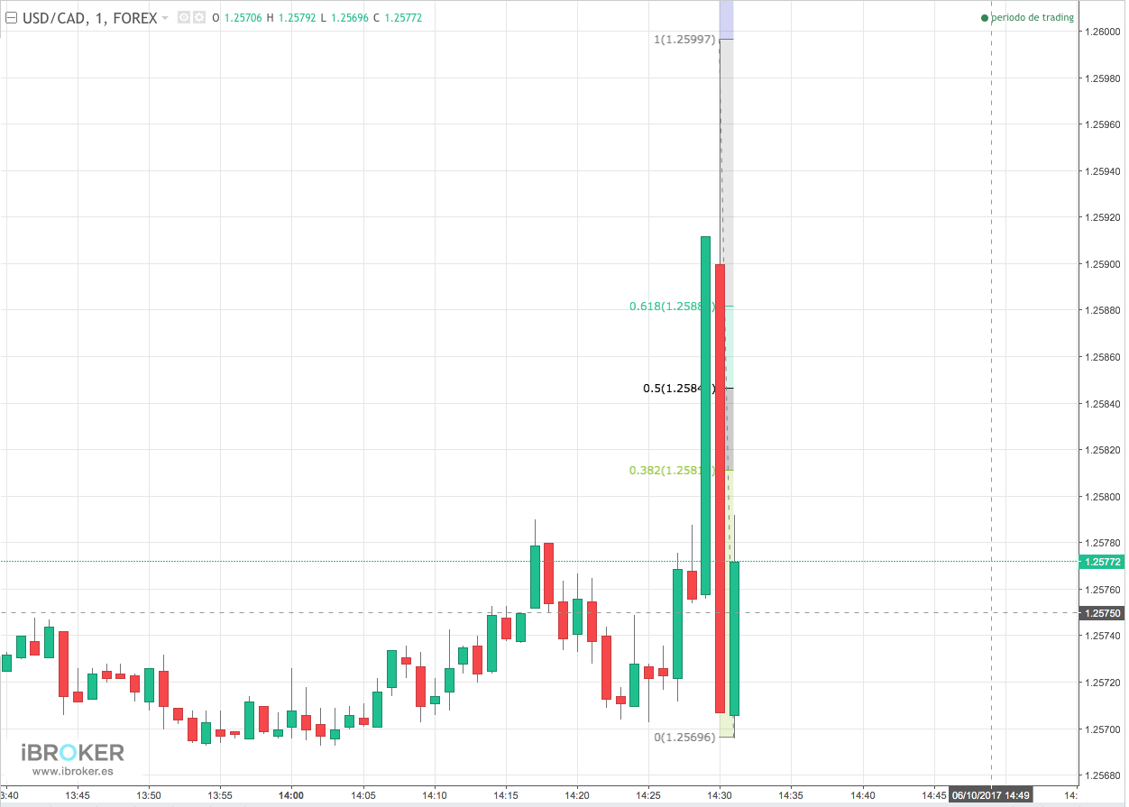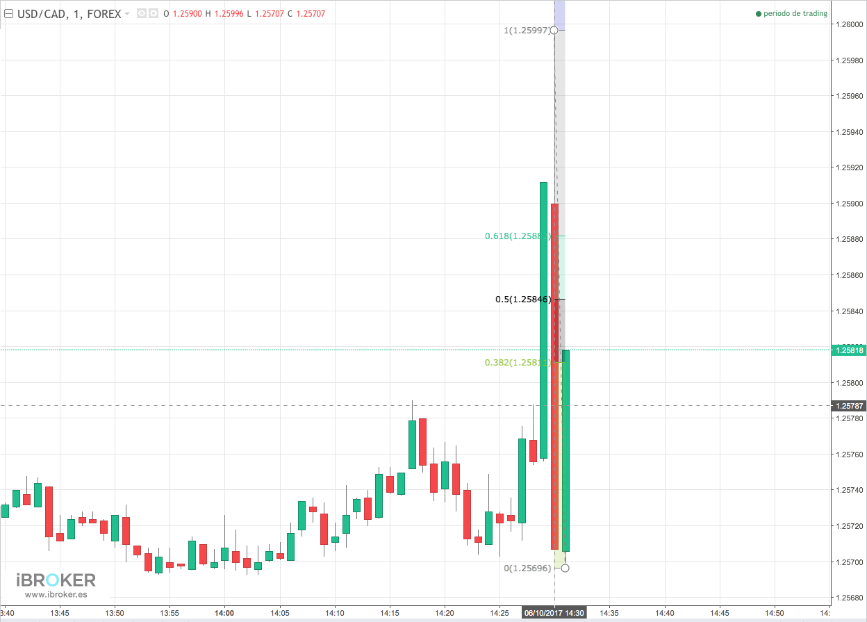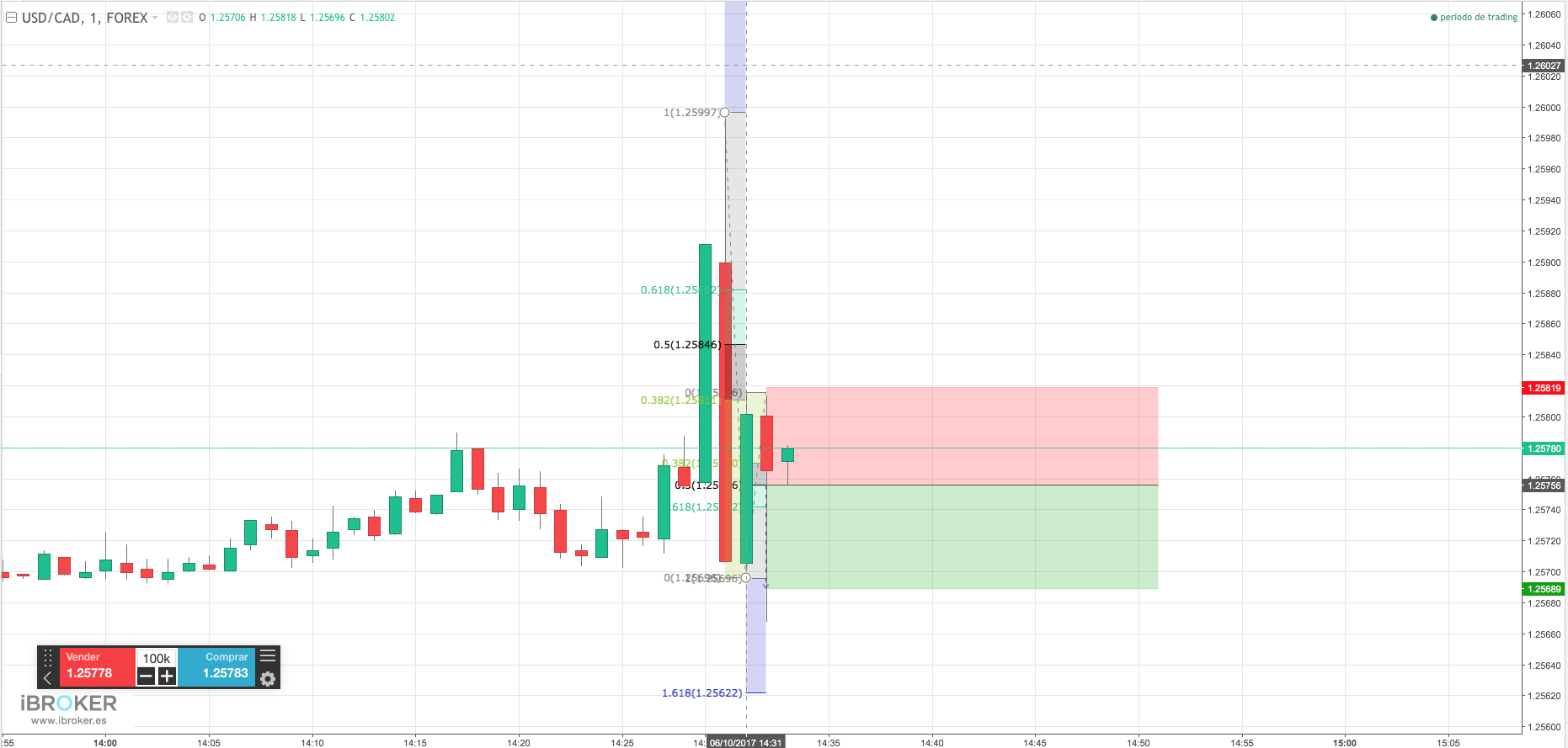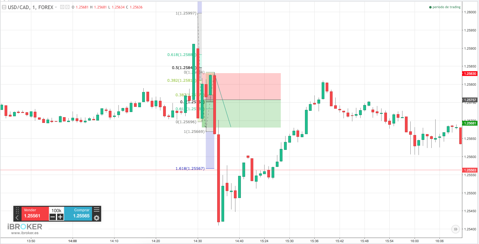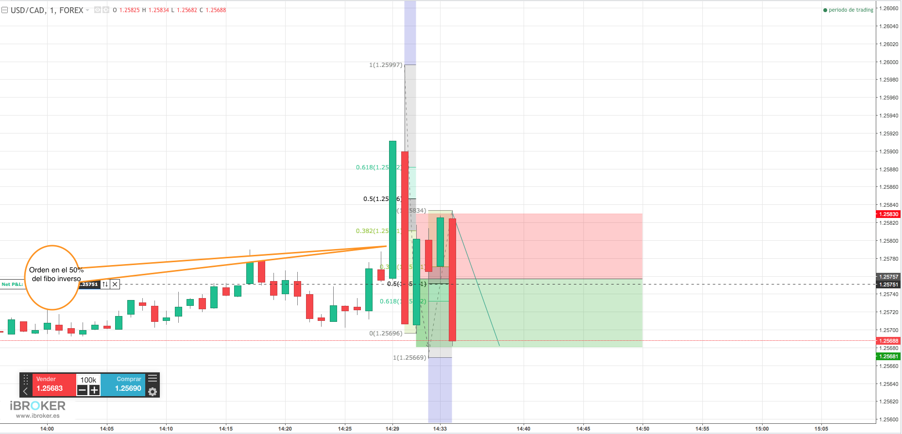 ¿Qué ha pasado después de salir del dato? El par ha subido para girarse pocos segundos después. Como bien te he comentado varias veces, el hecho de que se de un movimiento después de una trampa me hace confiar más en el movimiento que viene después. Por lo que el retroceso que estábamos esperando en el USDCAD era muy interesante. En estos casos, en los que se deja una trampa, el nivel de fibo lo cogemos desde el máximo que deja el precio.