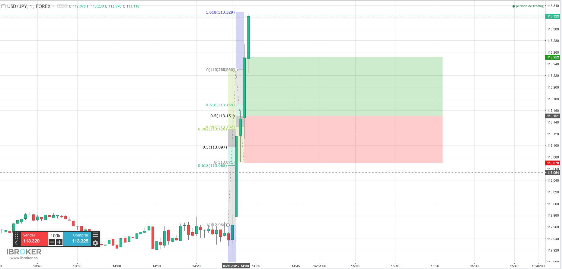 Una vez que se ha dado el primer movimiento en la vela de 1M y vemos el retroceso hasta la zona de 38%. Trazamos otro fibo desde el máximo 113,23 hasta el mínimo del retroceso, 113,07. La orden de compra la colocamos en 113,15 con el primer objetivo en zona de 113,23 y el stop debajo del retroceso. Como te decía el otro día podemos ir a por un segundo objetivo en la zona de 161% del fibo inverso. ¿Qué ha pasado con el dato de este mes? Como vemos ha tirado del USDJPY haciendo que se mueva en vertical después de la operación.