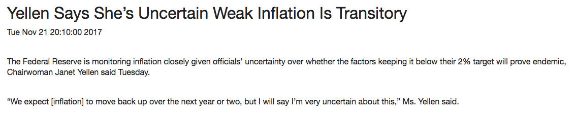 Un ejemplo lo tenemos el pasado día 21 de Noviembre con las declaraciones de la, todavía, presidenta de la FED en la que decía que la baja inflación quizá no sea algo transitorio. Si tenemos en cuenta que el mercado aunque está dando por sentado la siguiente subida de tipos en la próxima reunión de la FED está especulando sobre futuras subidas de tipos o no en el año que viene, esto podría ser un motivo para frenar en seco una subida de tipos al ritmo que se estaba hablando.