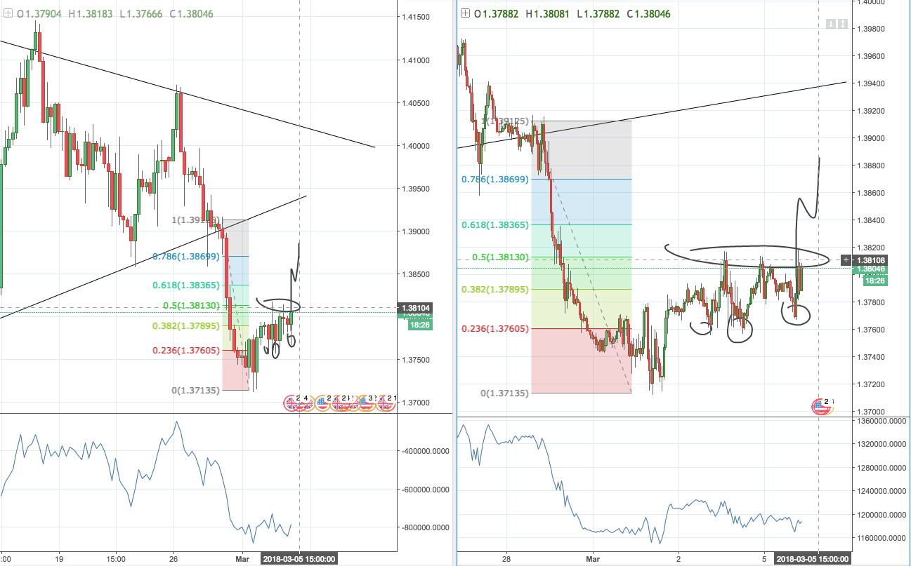 En cuanto a las divisas, vamos a fijarnos en la GBP, a pesar de que está siendo movida por factores políticos, vease Brexit, más que puramente económicos en cuanto a los datos que van saliendo, acabamos de tener dato de PMI de servicios mejor de lo esperado junto con un patrón característico de un activo antes de subir. Movimientos en V que dejan claro que el mercado a corto plazo no ve justo esos niveles y rápidamente los compra. Después de la formación triangular que se dio antes de caer, estábamos buscando un retroceso bajista que no llegó. Veremos si podemos hacer un retroceso alcista en marcos temporales de 1h aproximadamente si llega a romper la resistencia. No lo podemos saber todavía.