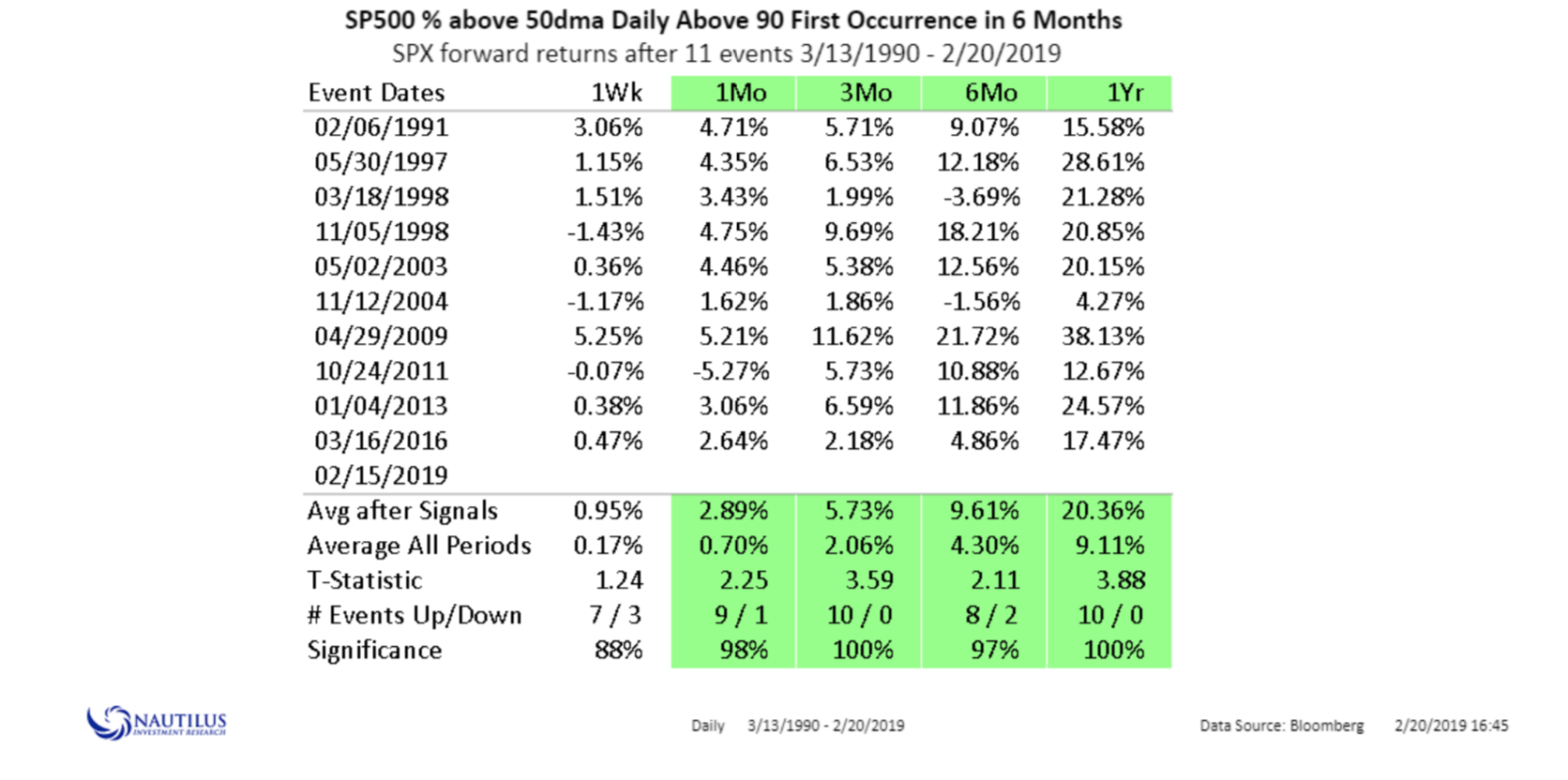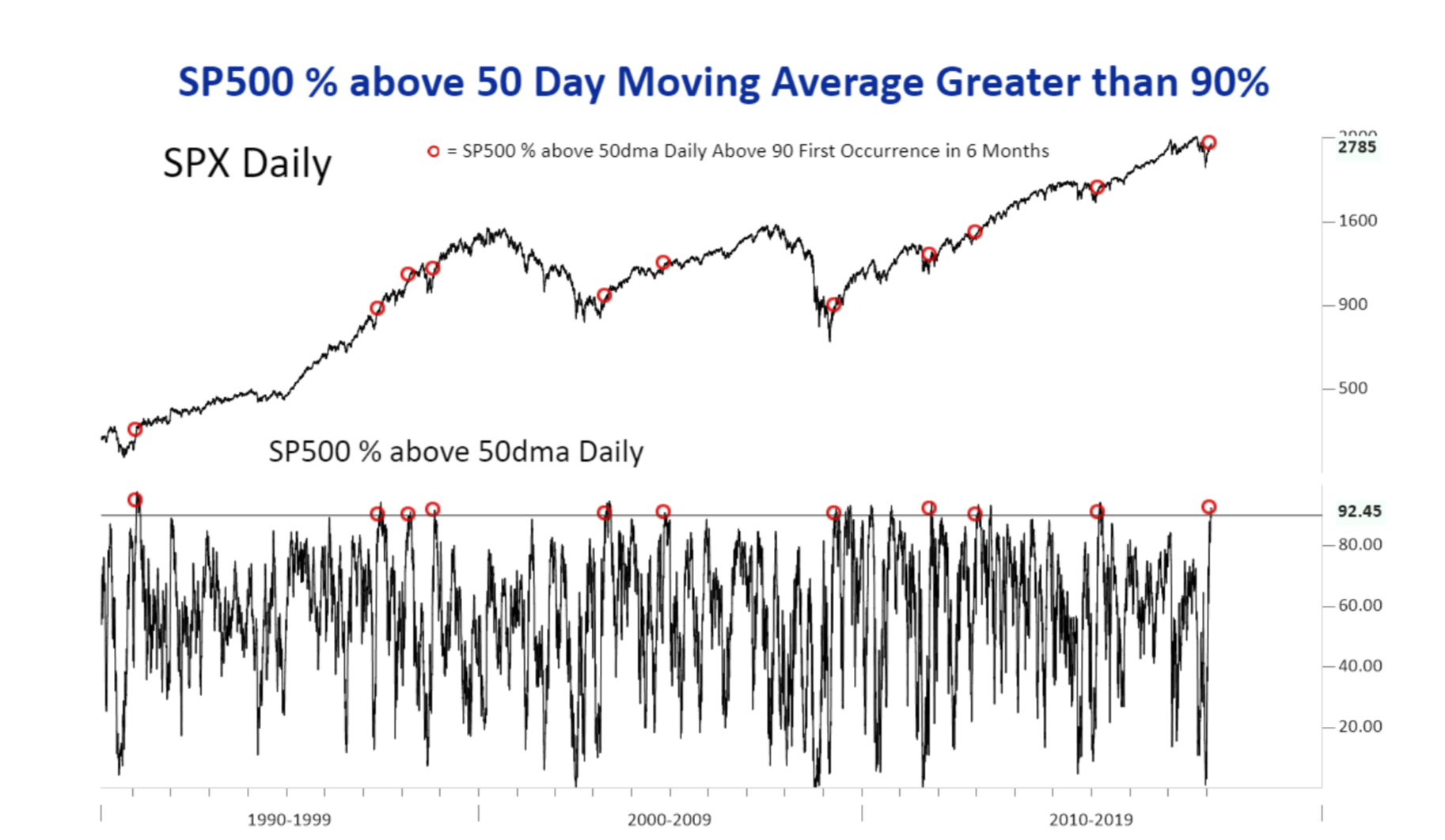 No obstante, seguro que sí sabe lo que es una media móvil. Pues bien, el 90% de las acciones del S&P500 están por encima de su media de 50 días. ¿Qué ha sucedido en el mercado cada vez se ha dado esta situación? Le cuento. Desde 1991 el S&P500 ha registrado subidas en torno al 20% un año después.