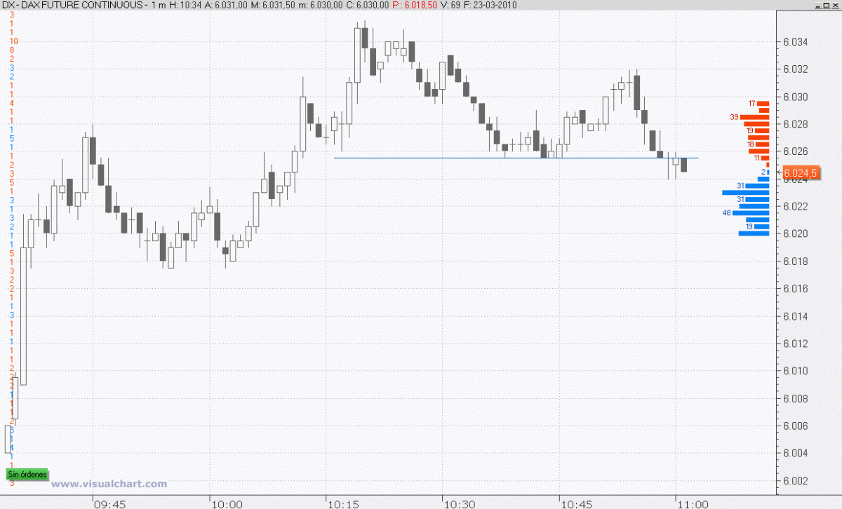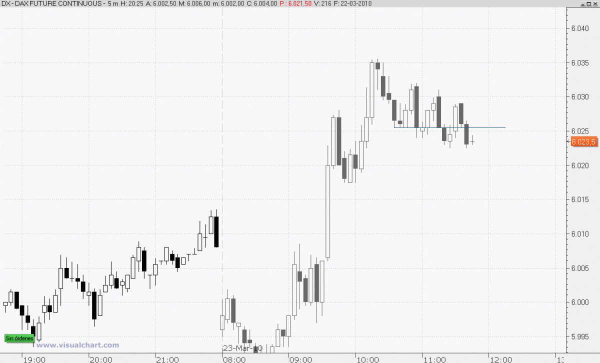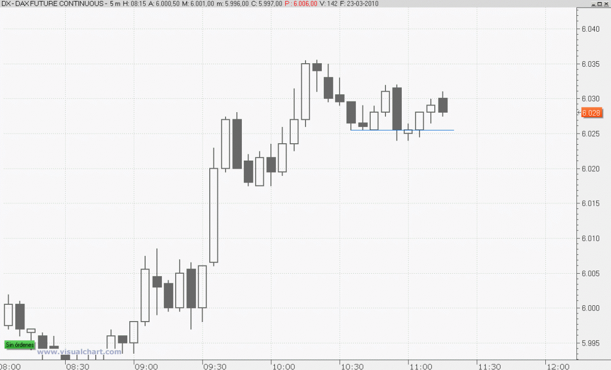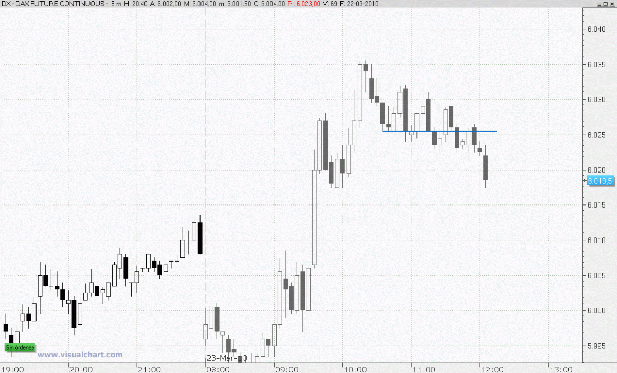 Como vemos en las gráficas, el no esperar a que el precio confirme a menudo nos dará un pequeño susto. Vemos por ejemplo, el DAX tanto en un minuto como en 5. Vemos un soporte que está a punto de ser quebrado, teniendo a los que están pensando adoptar posiciones bajistas con el botón de ratón cargado de contratos preparados para ser escupidos al mercado.