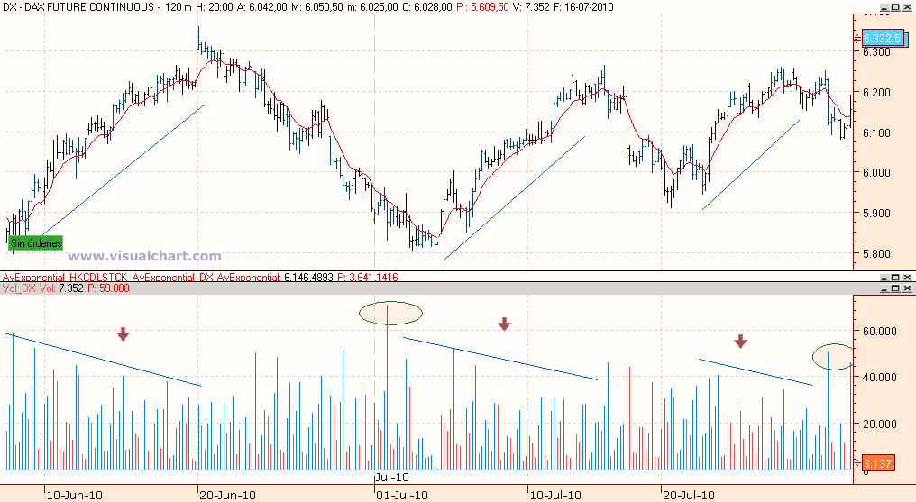 Como puedes ver en el gráfico del DAX esto se cumple muy frecuentemente. He señalado también lo que se suele llamar el volumen culminante, una subida de volumen muy por encima de la media que avisa de un posible cambio de tendencia en el corto plazo.
