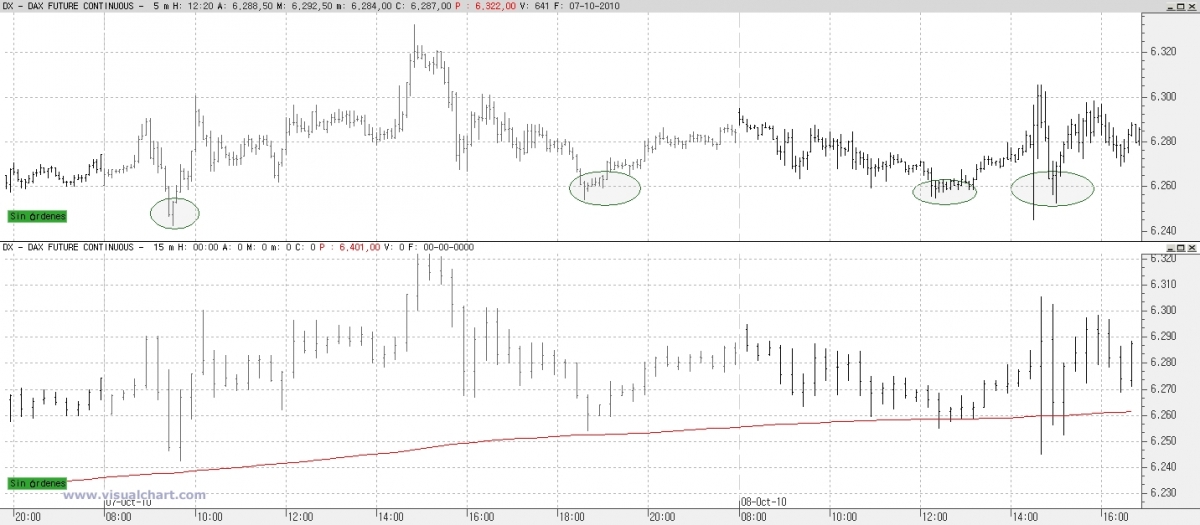 Como puedes ver en la gráfica, en la parte superior viene el gráfico del DAX en 5 min y en la parte inferior el gráfico de 15 min con la media de 200 sesiones. Obviamente vemos la repercusión en el precio a pesar de que aquellos que estén observando la gráfica únicamente de 5 min no puedan llegar a saber por cualquier herramienta utilizada en esa gráfica a qué se debe el rebote del precio.