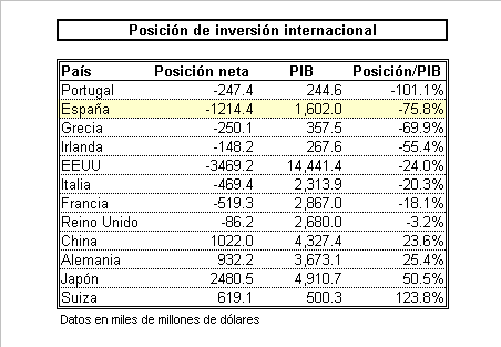 La siguiente tabla muestra la posición de inversión internacional de varios países a final de 2008 (excepto China, que el dato es de 2007). Este dato refleja la diferencia entre los activos (tanto físicos como financieros) que un país posee en el exterior y los que el resto del mundo posee en dicho país. Viene a ser la deuda neta con el exterior de un país.