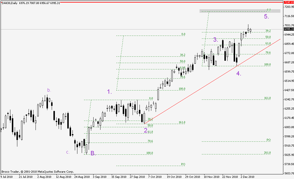 Tenemos una onda (1) que nos lleva al nivel 6339 de la cual la onda (2) corrija aproximadamente el 38% , empezamos la onda (3) que se relaciona con la anterior en aproximadamente el 1,618 , quedándose como se ve al arrastrar el Fibonacci algo corta , a continuación desarrolla una onda plana muy característica de continuación de tendencia y rompen arriba haciendo la onda que nos faltaba , onda (5) con una posible terminación a niveles del 7160 – 7175.
