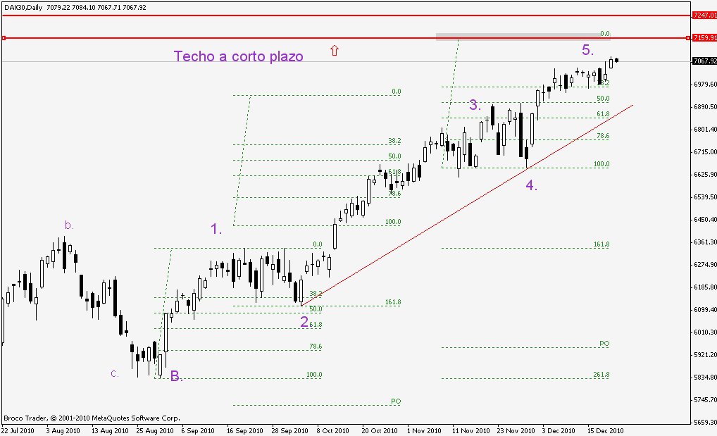 Quisiera indicar que a la vista de las pautas que manejamos tanto en el SP500 como en el DAX , los techos en estos índices están muy cercanos como veréis en el recuento del SP 500 el nivel del 1290 está muy próximos y en el recuento del DAX el nivel 7160 que manejamos para el dax esta a tan solo 100 puntos .