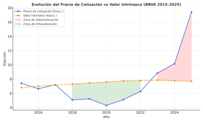 La zona roja refleja la sobrevaloración (precio > valor intrínseco), mientras que la zona verde representa oportunidades pasadas de infravaloración.
