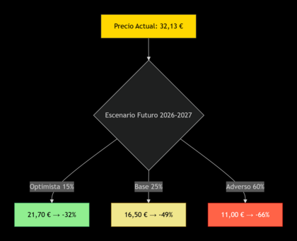 👉 Potencial caída desde 32,13€: entre –60% y –66%.