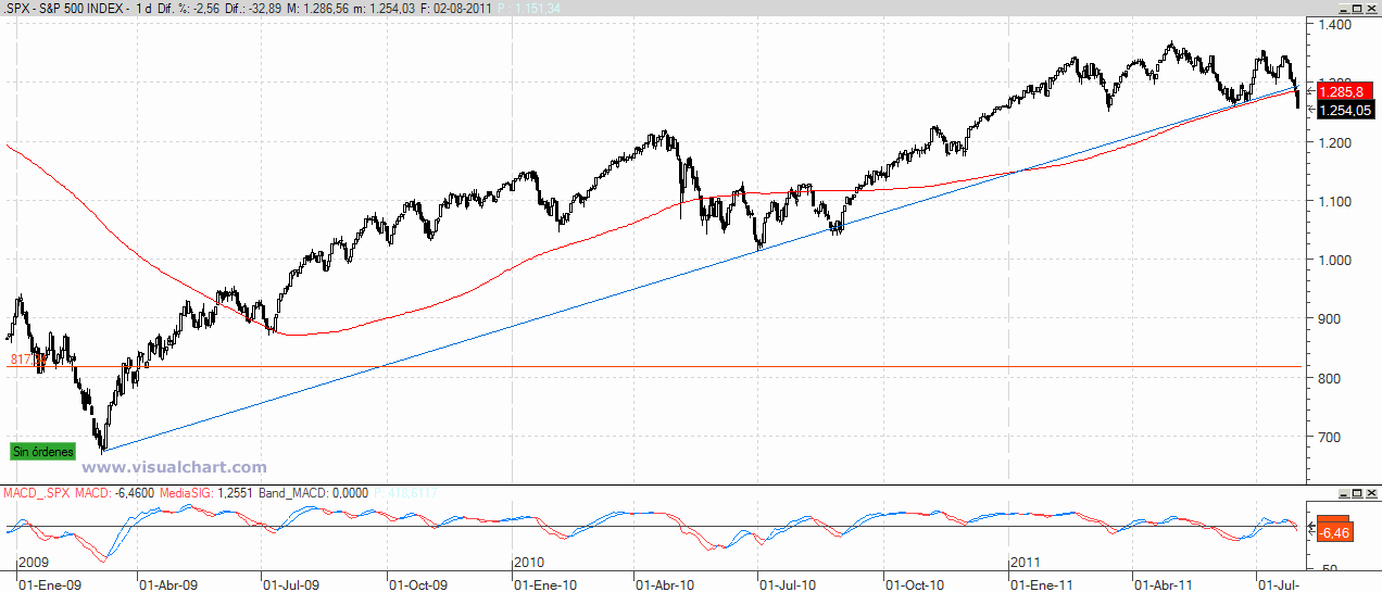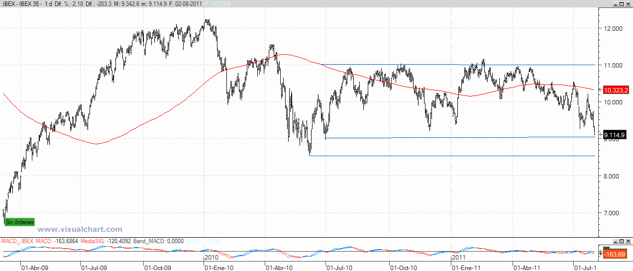 Ayer el SP perdió -2,56% y el dow perdió los 12.000 puntos y sobretodo perdieron la media de los 200 días por lo que los únicos mercados que aguantaban técnicamente, ya que el DAX ya lo había hecho en la jornada anterior hacen presagiar que si hoy no se corrije la situación el aspecto técnico acompañará a la incertidumbre económica que rige hoy en día en los mercados. Respecto al IBEX que tenía un comportamiento lateral desde el año pasado cuidado porque si pierde los 9.000 y sobretodo los 8.500 su comportamiento podría ser muy negativo ahora mismo.