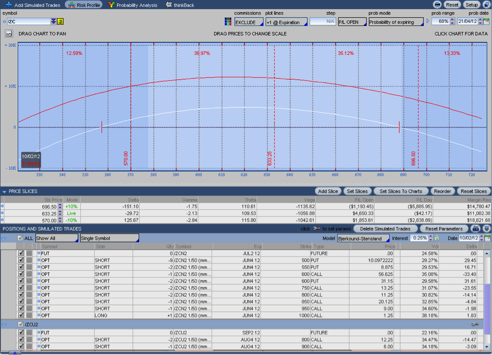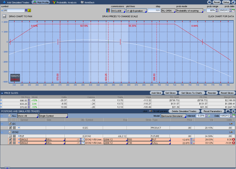 Unas aclaraciones mas para justificar la venta de la call de $750 a Julio en vez de los $800 o $850, muchos que me siguen saben que no soy finalista en opciones, por esto busco ventas de opciones con primas mas amplias, ya sabéis que muchas veces con un 60 a 80 % de beneficio ya recompro las opciones, pero en este caso hay una razón mas. Como todos bien sabéis es invierno y el maíz ni siquiera esta plantado, asi que por ahora solo hay especulación acerca de cuanto se plantara, los primeros datos de intenciones los tendremos a finales de Marzo 12, después empezara la plantación con sus riesgos y problemas, estos factores lo único que traen al mercado es incertidumbre y volatilidad. Mi idea es que antes de finales de marzo, pueda cerrar la operación de venda de calles con un beneficio cercano al 50 -60 %, con un buen beneficio 500-600 usd