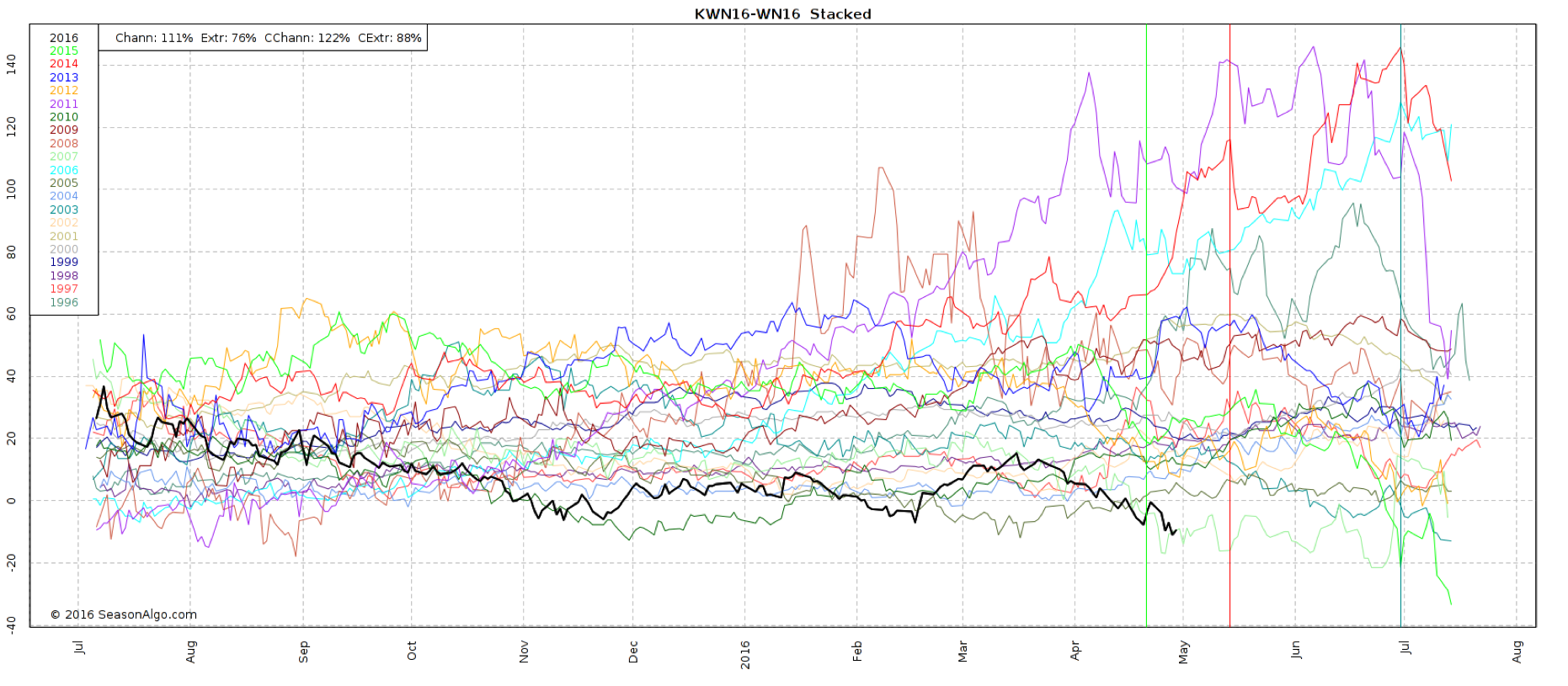 Como se puede observar en la mayoría de las ocasiones este par está en positivo y solo muy pero muy pocos años lo podemos ver en negativo y además en el par de Jul se puede observar un suelo muy pero muy fuerte en los -$20. Este suelo se debe a que por el diferencial de calidad si llega a -$20 dicen, y me repito dicen que hay un arbitraje, es decir merece la pena comprarlo en Kansas y entregarlo en Chicago.