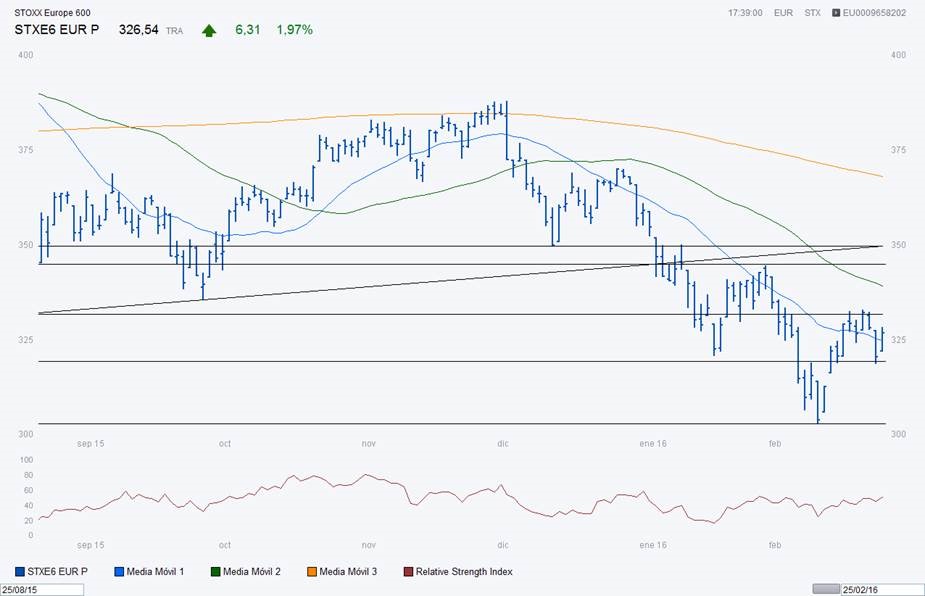 Llegados a este punto, el mercado ha intentado (de momento sin éxito) el reconquistar la zona de resistencia intermedia situada entre los 330 y los 335 puntos. Si el DJ STOXX EUROPE 600 consiguiera reconquistar y consolidarse por encima de esa zona en un futuro relativamente próximo, sería una señal favorable de cara a dar por cerrada esta fase correctiva, fijando como el siguiente objetivo alcista más inmediato la franja comprendida entre los 345 y los 350 puntos (a un +7% por encima de los niveles actuales). Por el momento, el retroceso (“pull-back”) de ayer, ha servido para reforzar el soporte intermedio en el entorno de los 318 puntos, y el giro alcista de ayer en la recta final de la sesión estadounidense y hoy ya en Europa (a pesar de una caída de la bolsa china esta madrugada del -6.4%) resulta prometedor de cara a un nuevo ataque a dicha zona intermedia de resistencia entre los 330 y los 335 puntos (los indicadores de “momentum” en zona neutra, esto es, sin dar señales de sobre-compra ni de sobre-venta pero en tendencia alcista, también apoyan en este sentido).