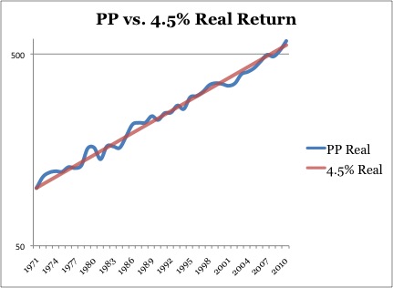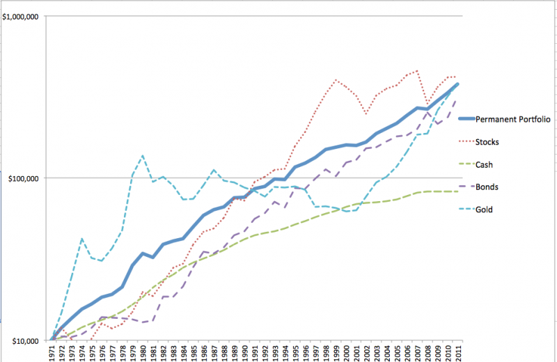 Como una imagen vale más que mil palabras, en la entrada de hoy voy a hacerme eco del hilo publicado por el usuario Tyler en el foro americano de la Cartera Permanente: Why I Invest in the PP, in Pictures. Para empezar, la clásica comparativa entre el rendimiento histórico de la Cartera Permanente (en este caso, y en el resto de gráficos, de la versión americana en dólares) frente a sus cuatro activos individuales: