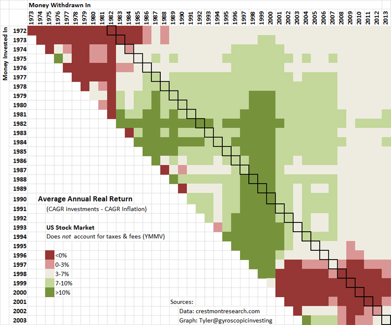 La Cartera Permanente es aburrida y predecible, pero da igual el año en el que hubieras invertido, tras 10 años siempre habrías obtenido entre un 3% y un 7% de rentabilidad anual por encima de la inflación. De hecho en el peor de los casos (1999), a los 3 años ya habrías obtenido una rentabilidad media anual positiva por encima de la inflación. Comparado con la inversión en bolsa, si hubieras invertido a principios de los 70, a finales de los 90 o a comienzos de siglo, la paciencia tendría que haber sido la mayor de tus virtudes para soportar tantos años negativos.