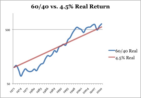 Hace poco el forero Gfierro publicaba un artículo en el que demostraba la dificultad de elegir una tasa de retirada segura para vivir de las rentas de nuestra cartera. El problema es que ante una cartera volátil, una retirada anual similar a la tasa media de retorno de la cartera tiene altas probabilidades de fracaso, ante la posibilidad de sufrir una mala racha prolongada. Sin embargo, si lo que tenemos es un crecimiento sostenido muy poco volatil podemos retirar una cantidad de dinero mayor cada año con mayor seguridad, lo que implica que una cartera más pequeña y estable nos puede permitir vivir en nuestro retiro igual o mejor que con una cartera mayor pero más volátil.
