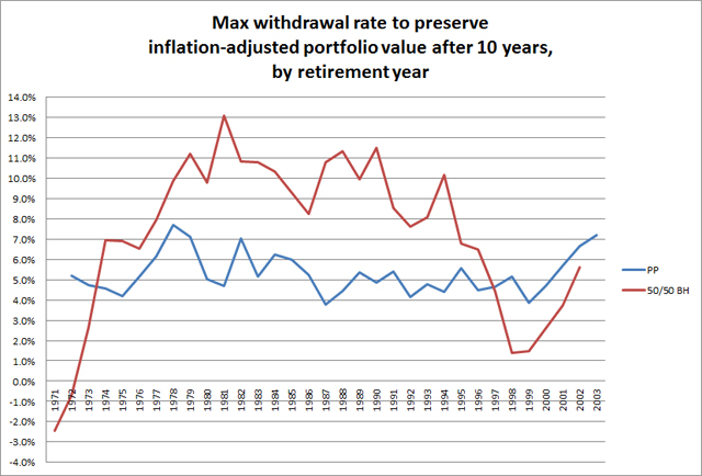 Como ejemplo práctico, a continuación puedes ver la comparativa entre la Cartera Permanente y una cartera moderada-conservadora con un 50% de renta variable y un 50% de renta fija. La línea define para cada año de retiro, qué porcentaje máximo anual podríamos haber retirado para que después de 10 años nuestra cartera hubiera preservado su valor inicial ajustado a la inflación.