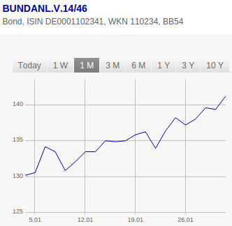La utilización de este activo en la Cartera Permanente, con un peso del 25%, no es caprichosa, ya que su función es protegernos de (y ganar con) la deflación. Y vaya si funciona, no hay más que ver los resultados del pasado año, en el que las tasas negativas de inflación en Europa impulsaron nuestro bono alemán de 30 años casi un 35%. "Pero al nivel que terminaron los tipos en 2014 este año los bonos ya sí que solo pueden bajar, ¿no?" Pues de momento parece que tampoco, porque el actual bono alemán más largo ha cerrado enero con una revalorización superior al 10%: