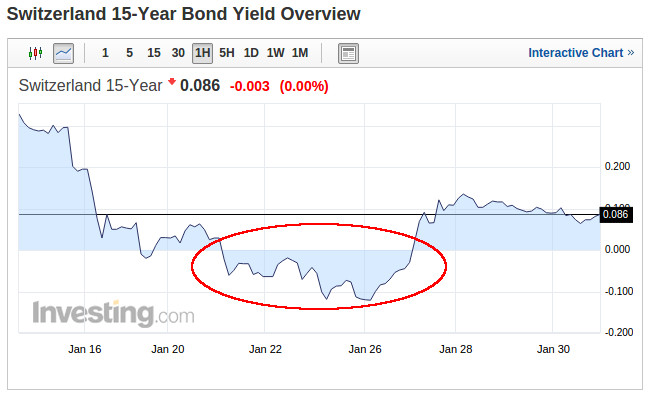 En cuanto a la segunda afirmación, hace tiempo que los tipos de interés negativos están con nosotros, empezaron con la deuda de corto plazo pero ya han llegado hasta los bonos alemanes de 5 años. ¿Y más allá? Pues aquí tienes los del bono suizo de 15 años, repito bono de 15 años: