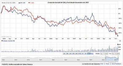 Como podemos observar en el gráfico desde Noviembre de 2003, General Motors y Ford han perdido más del 80% de su valor en bolsa.