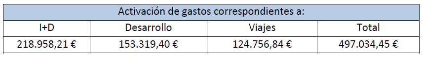 • Activación Gastos de Desarrollo: Se han activado los gastos en función de su vinculación directa con el área de Desarrollo, estimando un porcentaje cuando no ha sido posible su individualización. Todos los gastos de Desarrollo se han activado según la norma contable española y la norma internacional NIC 38 (IAS IRFS 38), siendo costes incurridos hasta la puesta en marcha y en funcionamiento del mismo dado que su coste puede ser medido de forma fiable y se espera obtener beneficios económicos para la empresa.