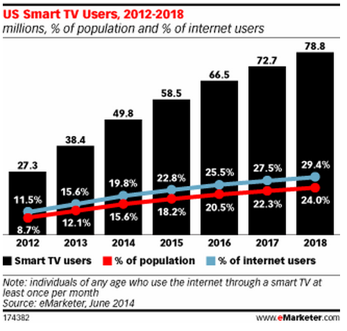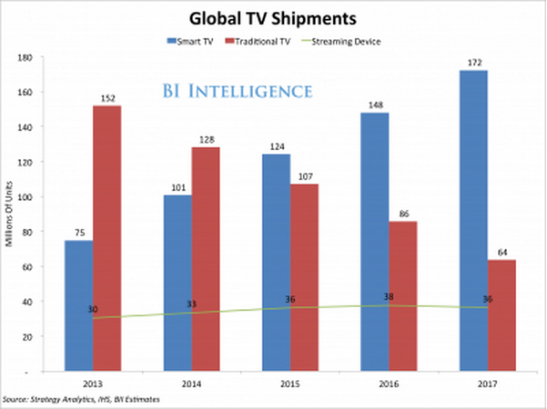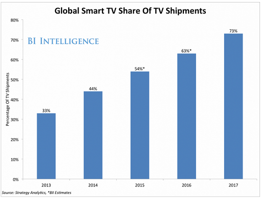 Smart TVs are on pace to dominate the television market. They will account for 73% of global flat screen TV shipments by 2017, up from just 33% in 2013, according to Strategy Analytics.