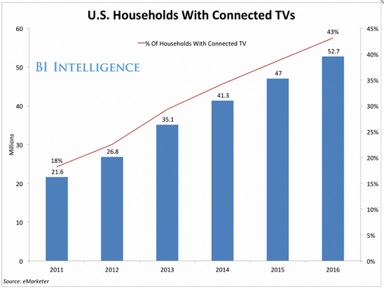 In the U.S., connected TVs — including smart TVs and streaming devices — will be in 43% of households by 2016.