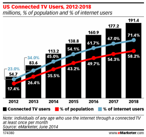 eMarketer defines connected TVs as sets hooked up to the internet through any means, including a built-in network connection or a third-party device such as a game console, set-top box, or laptop. We have raised our forecast for connected TV users in the US from our January 2013 projections based on new comparative data, expected releases of new smart TV and set-top box models in the coming years, and falling price points of these devices.