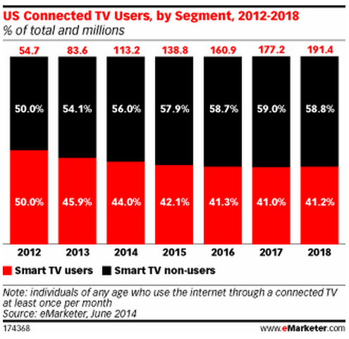 Due to an increasing number of consumers accessing TV, movies and other video content via set-top devices, gaming consoles and Blu-ray devices, the share of smart TV users as a percentage of connected TV users will decrease slightly between 2014 and 2018, while the portion of smart TV non-users will rise. This year, smart TV non-users will account for 56.0% of connected TV users. By 2018, this will grow slightly to reach 58.8%.