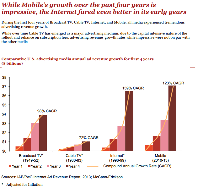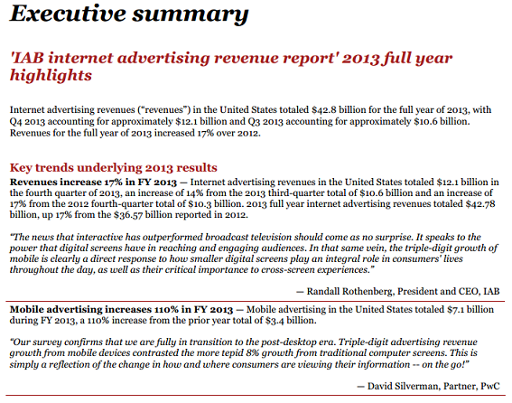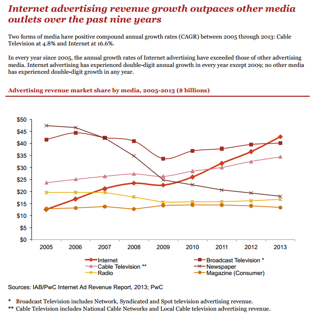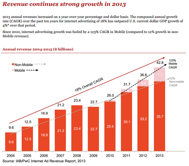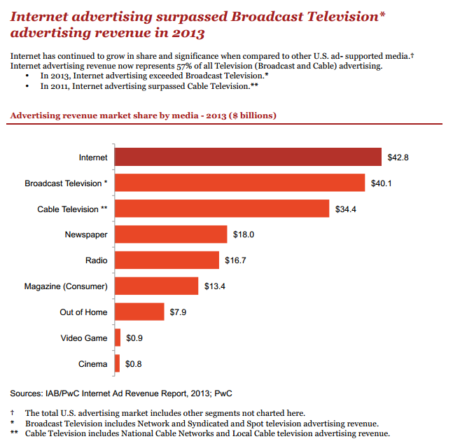 El Buró de Publicidad Interactiva (IAB) informó el jueves que los ingresos de publicidad en Internet aumentaron 17% a un récord de 42.800 millones de dólares en 2013. En comparación, la publicidad en la televisión abierta generó 40.100 millones en 2013.