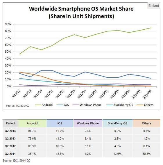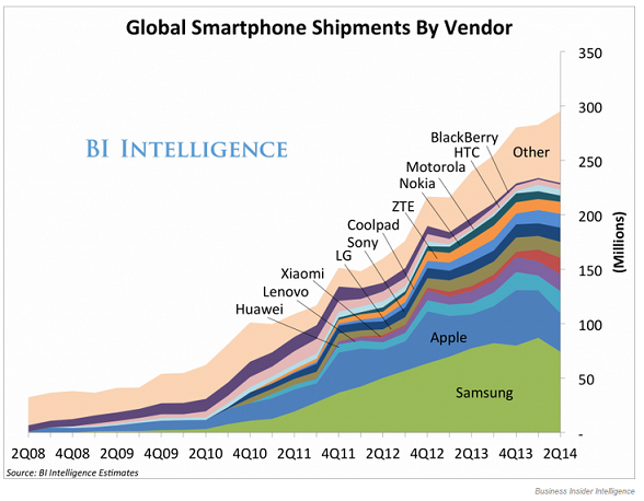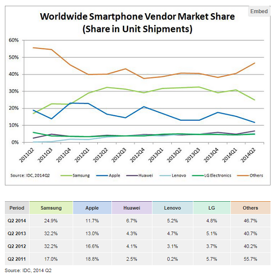 Sin embargo, la nota predominante viene dada por el "auge low cost" (mencionado prácticamente en todas las fuentes de información), ya que como comprobaremos a continuación tanto Samsung como Apple ven reducida su cuota de mercado en detrimento de las "otras marcas".