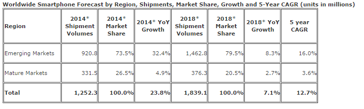 Nos encontramos con un mercado todavía en crecimiento, sobretodo en lo referente a los mercados emergentes los cuales presentan un crecimiento del 32,4% (respecto al año anterior) y un CAGR del 16% en el intervalo 2014-2018. No es de extrañar el interes tanto de "pequeños" como de "grandes" por este mercado.